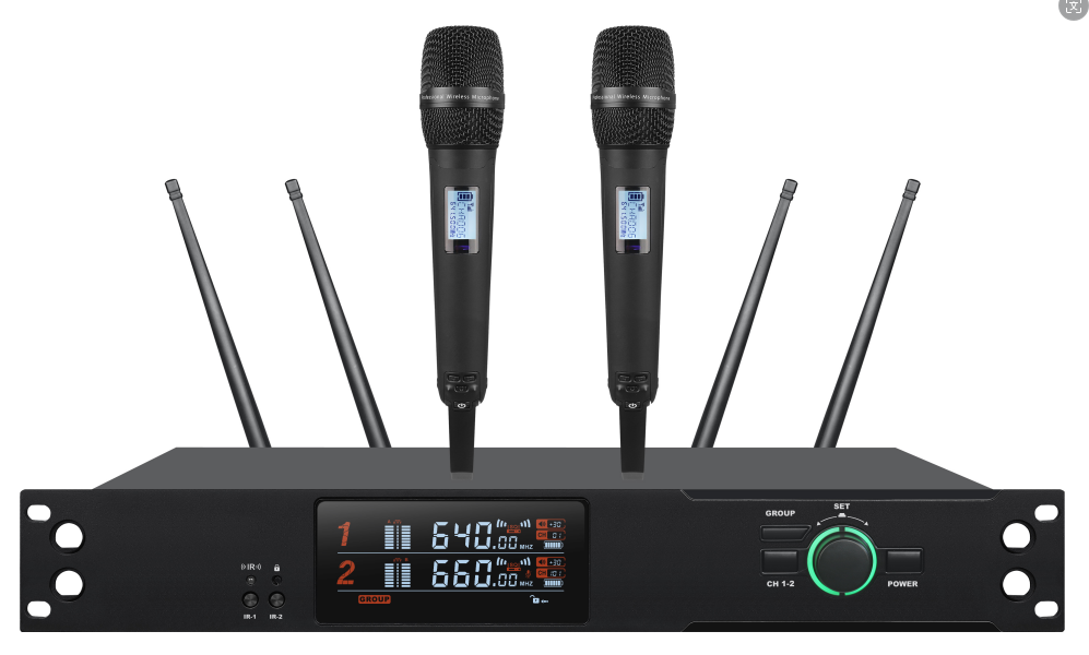 采用雙通道真分集式接收技術(shù). 每一路話筒信號都標(biāo)配兩組接收電路同時接收信號,有效增強信號穩(wěn)定性.